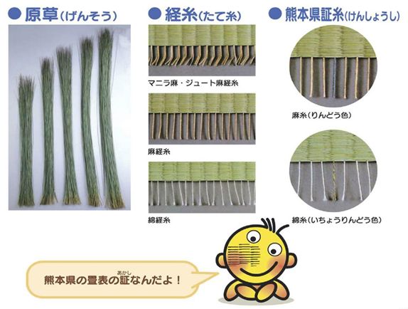 1枚の畳表には、約4000本〜8000本のイ草が使われています。良いイ草は、茎に変色や傷などがなく、根元から先端まで充実して1本1本の太さや色が揃っているものです。畳表は単にイ草を敷き詰めたのではなく、足にしっくりとなじむように、イ草の1本1本に経糸(たていと)というものを絡ませて、表が均一になるように機械で丁寧に編んでいるのです。